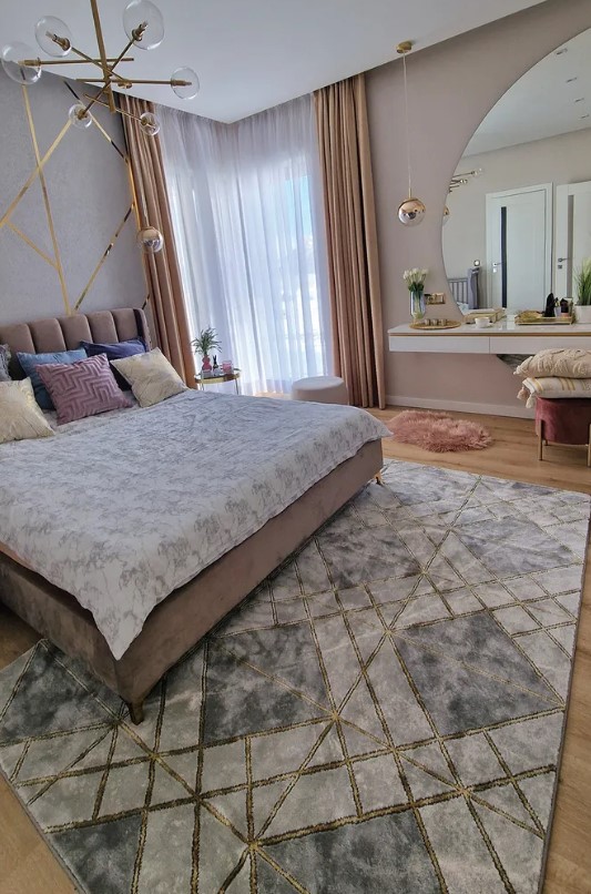 Nie każdemu odpowiada wyłącznie spokojna kolorystyka. Wiele osób traktuje sypialnię jako przestrzeń, która powinna być nie tylko wygodna, ale i ciekawa. Dlatego w 2025 roku tak modne stają się dywany z geometrycznymi liniami, abstrakcją czy kontrastem. Takie wzory wprowadzają lekki ruch do wnętrza. To idealne rozwiązanie dla osób, które rano chcą poczuć energię, a wieczorem docenić subtelną grę form i kształtów. W połączeniu z neutralną pościelą czy delikatnym oświetleniem, geometryczny dywan nie przytłacza, lecz dodaje wnętrzu wyrazistości. Duży dywan w geometryczne desenie porządkują przestrzeń, podkreślając układ sypialni. To także dobry sposób na przełamanie monotonii, jeśli inne elementy są utrzymane w stonowanej kolorystyce.